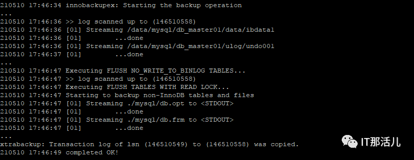 innobackupex --defaults-file=/data/mysql/db_master01/conf/master01.cnf --socket=/data/mysql/db_master01/mysql.sock -uroot -p'123456' --stream=tar /tmp > /data/DBbackup/master01/master_tar.tar