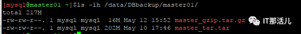 innobackupex --defaults-file=/data/mysql/db_master01/conf/master01.cnf --socket=/data/mysql/db_master01/mysql.sock -uroot -p'123456' --stream=tar /tmp | gzip - > /data/DBbackup/master01/master_gzip.tar.gz