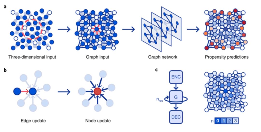 在 2020 年第二季度,DeepMind 还发布了关于使用 GNN 来解释玻璃的形成、并对制造业和其他行业产生影响的研究。DeepMind 使用 GNN,仅仅用粒子的初始状态就能预测玻璃态系统的长期演变,在不同温度、压强和密度范围都表现良好。在这个项目中,节点和边分别是 “粒子” 和 “它们间的相互作用”。其中 AI 被用来预测玻璃分子在液态和固态间的运动变化过程。