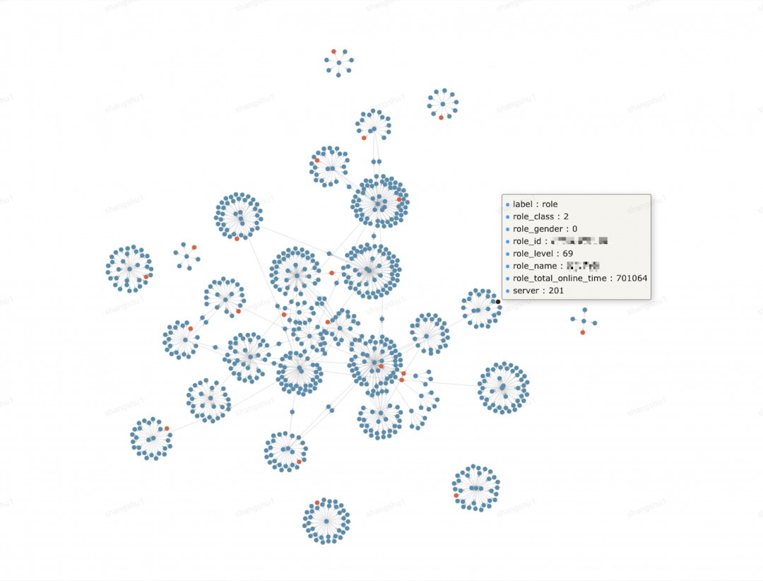 下图展示了社交关系图的一个局部(蓝色是玩家,红色是帮会),可以看到,游戏中大多数玩家都是围绕着帮会报团,同时,部分帮会间成员之间也存在紧密的关系。