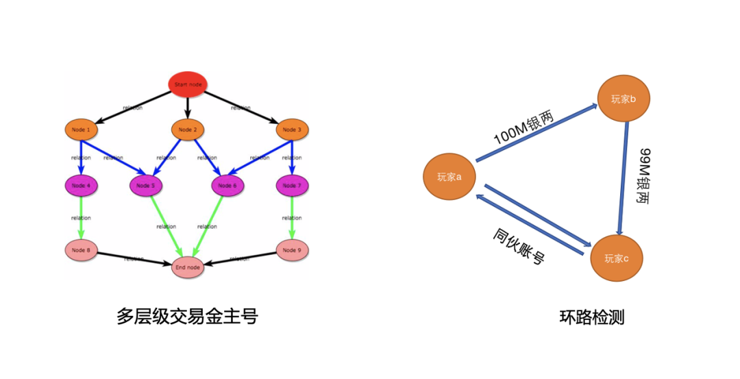 图模式识别:MMORPG游戏中,存在着大量的交易行为,一些不法的工作室,会创建一批角色进行薅羊毛,然后将资产通过中间账号最终汇集给金主号,这种薅羊毛的行为可以抽象成图上的模式匹配。