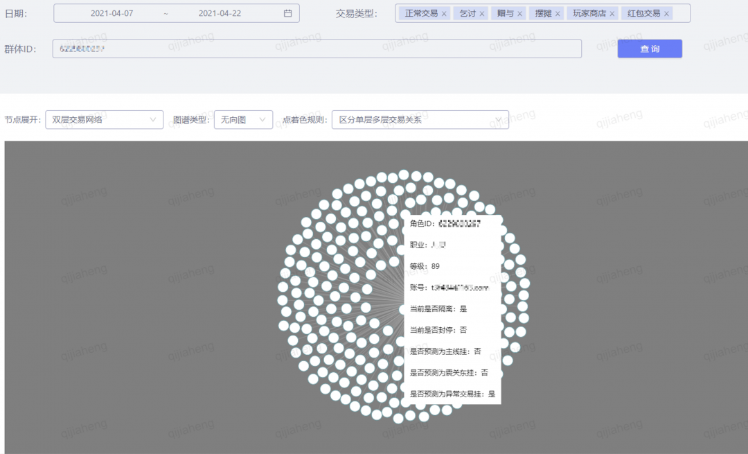 风控是图数据库最典型的一类应用,其中比较重要的一环是异常交易检测。网易伏羲智能用户画像平台集成了图计算的能力来分析玩家之间的交易链路,能够有效抓取循环交易、层级交易等作弊行为。交易图中,玩家被抽象成为图中的点,玩家之间的各种交易行为(正常的面对面交易、摆摊、玩家商店交易、红包、赠予等)被抽象成为图中的边,然后基于游戏日志进行数据加工并导入到图数据库中进行分析,分析支持指定时间区间,支持基于单层交易网络或多层交易网络进行展开。除了通过探索的方式抓取作弊行为,该工具还可以用来进行算法效果的验证,例如,算法同学通过机器学习的方法抓到一批疑似玩家,游戏策划同学可以从中选择几个玩家并通过这个工具来分析其交易链路,判断算法的效果。