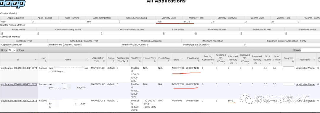 于是花了点时间研究了一下Yarn调度,线上环境默认的调度是Capacity Scheduler(常用的调度还有Fair Scheduler):是Hadoop的一种可插拔调度器,允许多租户安全地共享一个大型集群,以便在已分配容量的约束下及时分配应用程序的资源,详情介绍见官网:https://hadoop.apache.org/docs/current/hadoop-yarn/hadoop-yarn-site/CapacityScheduler.html。其中关于调度很重要的参数在配置文件中:capacity-scheduler.xml。