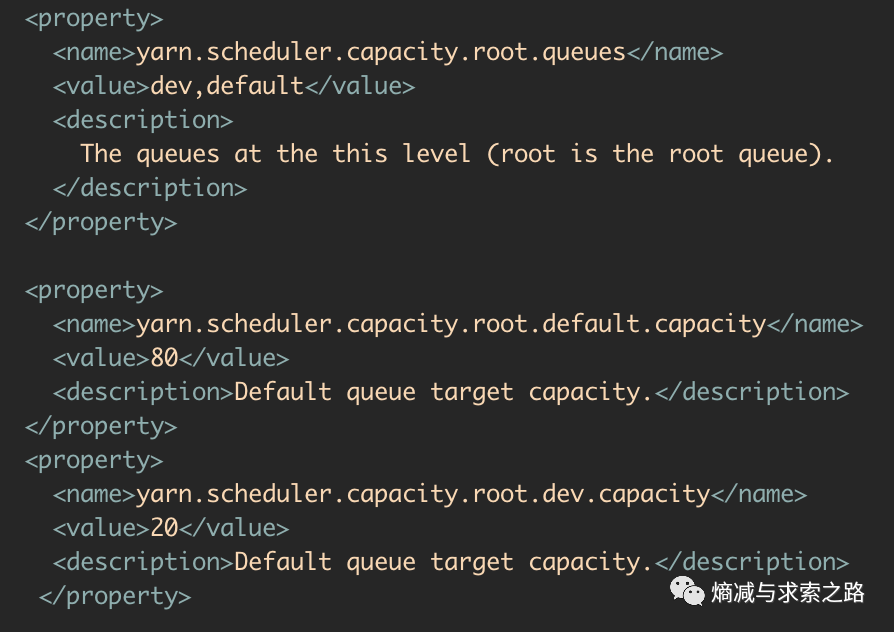 1.Capacity调度器默认有一个预定义的队列——root,所有的队列都是它的子队列(默认子队列default)。队列的分配支持层次化的配置,使用.来进行分割,比如yarn.scheduler.capacity.<queue-path>.queues。(下图 dev和default是root的子队列,以及每个队列的容量设置)