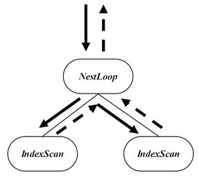 标准的迭代器模型如图1所示。控制流向下(下图实线)、数据流向上(下图虚线)、上层驱动下层(上层节点调用下层节点要数据)、一次一元组(下层节点每次只返回一条元组给上层节点)。