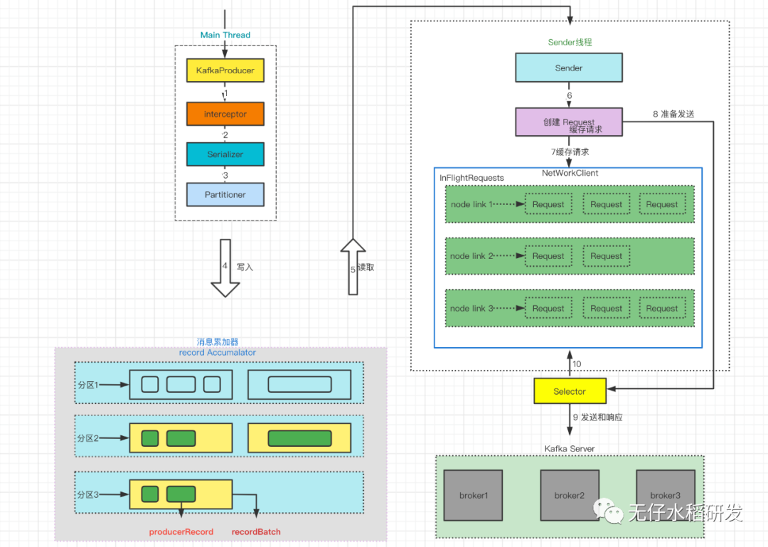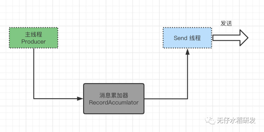 主线程负责生产消息,消息并不是直接交给 Send 线程,而是先交给一个叫做 消息累加器(RecordAccumlator) 的组件。