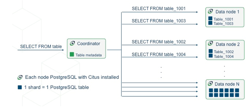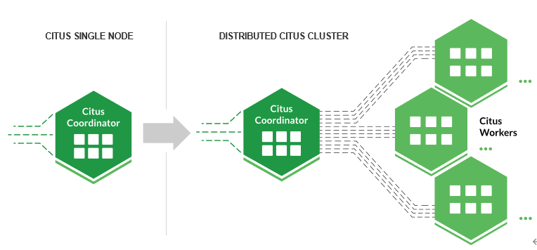 Citus 是一种 PostgreSQL 扩展,它允许数据库服务器(称为节点)在“无共享”架构中相互协调。 这些节点形成一个集群,允许 PostgreSQL 保存更多数据并使用比单台计算机更多的 CPU 内核。这种架构还允许通过简单地向集群添加更多节点来扩展数据库。