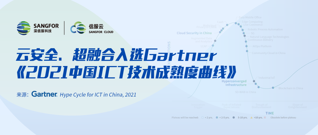 近日,全球权威咨询分析机构Gartner发布了《2021中国ICT技术成熟度曲线》(Hype Cycle for ICT in China, 2021 )报告,深信服(Sangfor Technologies)凭借着领先的技术实力,成功入选云安全和超融合代表性厂商(Sample Vendors)。