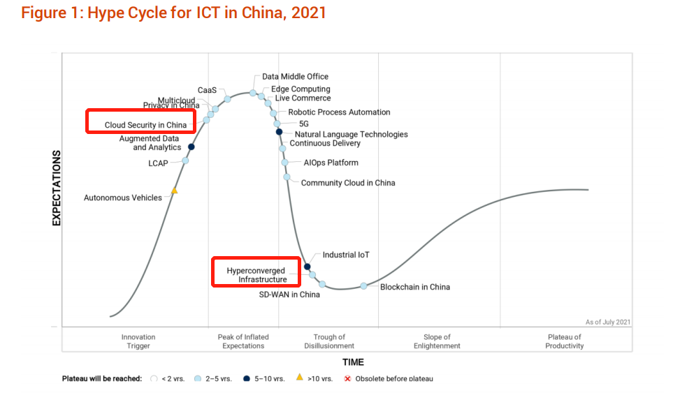 Gartner预测:云安全有望在2-5年内达到爆发式发展的高峰;超融合可能2-5年内经过低谷期,进入完全生产力状态