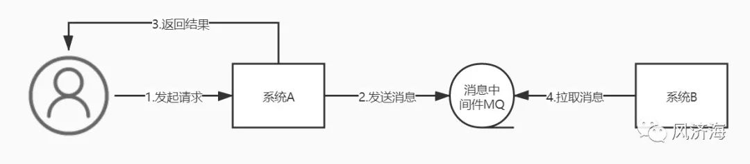 系统中常见的应用场景:消息中间件,如下图,通过使用消息中间件,提升了系统A的性能、降低系统A和系统B的耦合度、流量削峰。