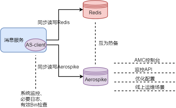 观察阶段: Redis操作成功后,对Redis的读写操作以异步方式同步到Aerospike,Aerospike不承担具体业务。下一步是数据双写Redis和Aerospike。该阶段主要观察两边数据是否一致,Aerospike压力等。同时,观察阶段可以进行节点重启、集群扩容等运维操作,评估运维成本,优化配置等。这里可使用AMC页面控制台、监控API来监控集群状态,客户端调用部分记录必要日志和监控信息。