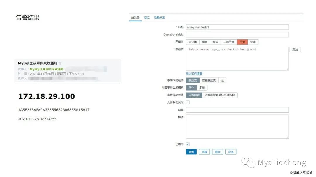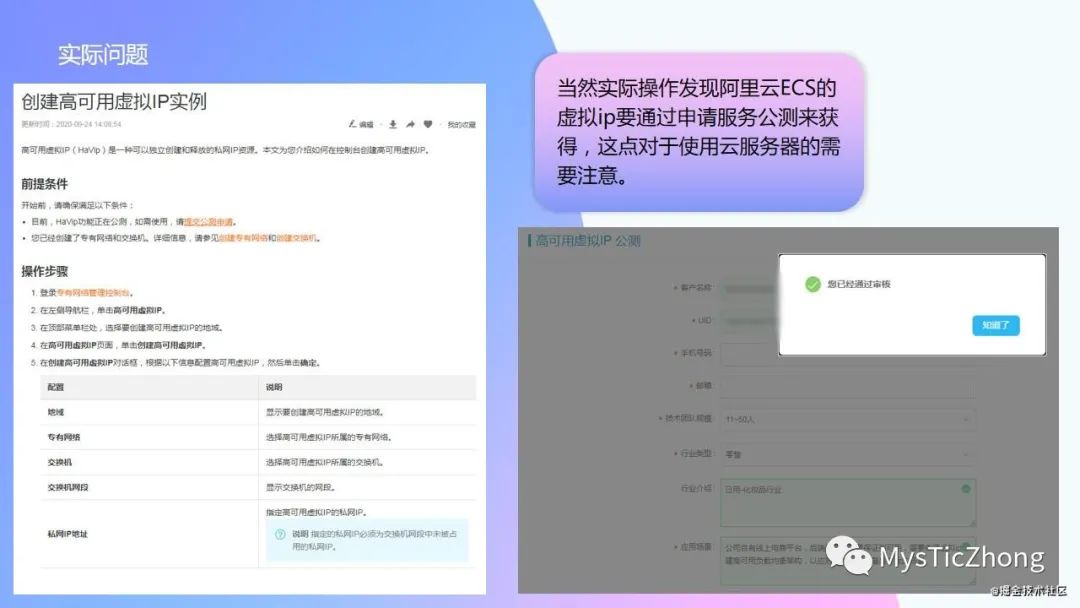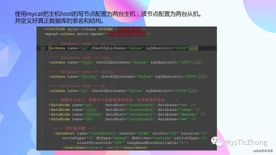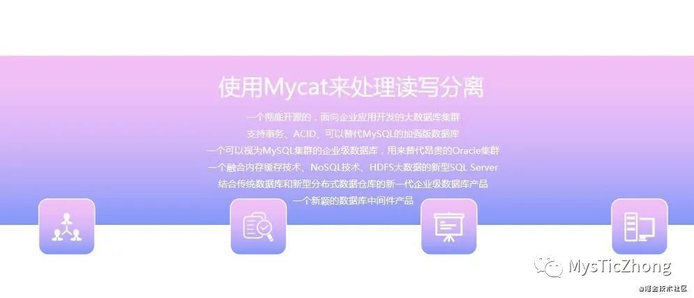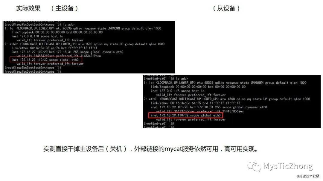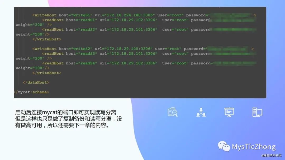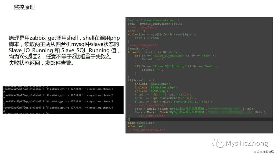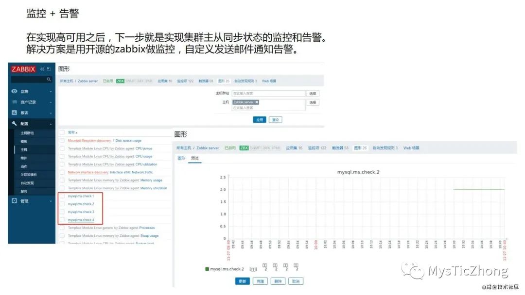 详细的搭建技术细节已经体现在下面PPT贴图中,这里用最简单的文字叙述下大体方案:4台机分两组主从,两个主机再互为自从;用mycat做读写分离;为保证高可用加上keepalived,前置一个虚拟ip;为可视化监控和告警用了zabbix,定时读取状态,异常邮件通知;后来因为主从同步延时过慢,尝试过半同步复制,最后改用组复制MGR保证数据一致性(组复制对网络要求高,因此升级了内网规格)。