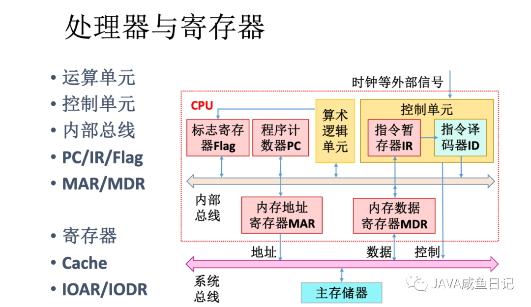 运算单元 控制单元 内部总线 寄存器(Flag/PC/IR/MAR/MDR/通用寄存器/IOAR/IODR) 高速存储缓冲(cache)
