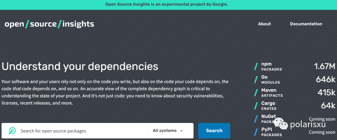 https://deps.dev/,这是 Google 新出的一个实验性工具,命名为:Open Source Insights,它能让你更了解你的项目依赖。