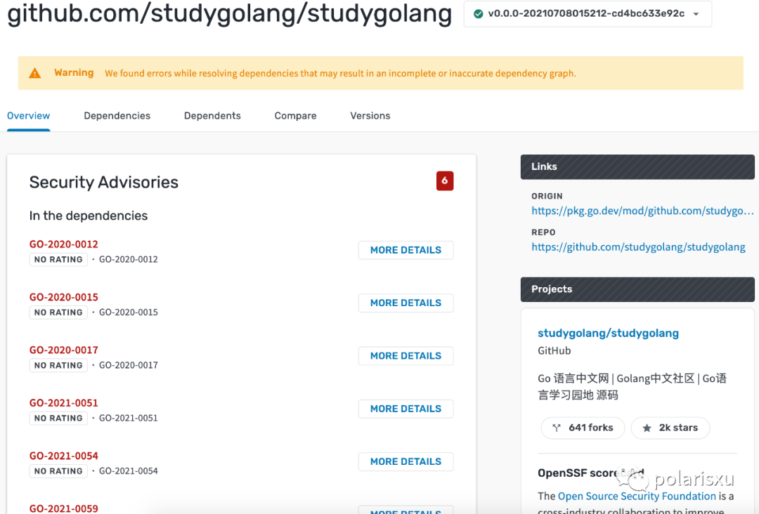 输入包名:github.com/studygolang/studygolang,https://deps.dev/go/github.com%2Fstudygolang%2Fstudygolang 结果如下: