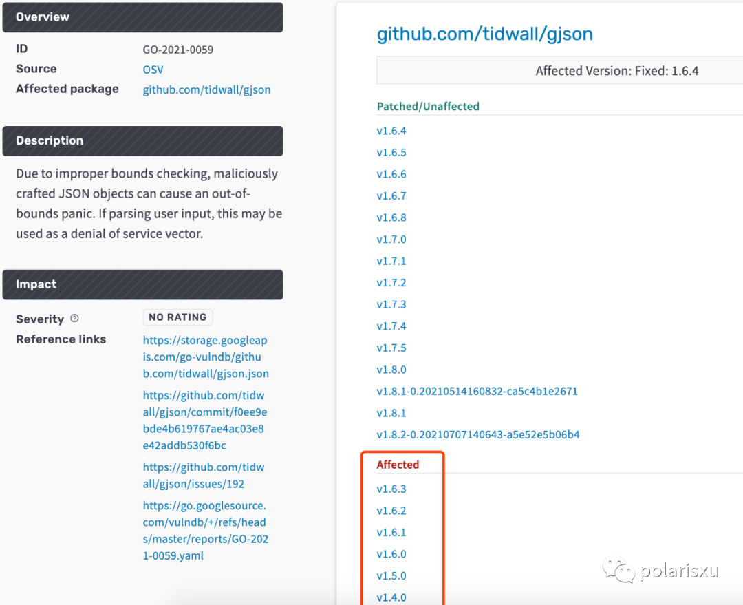gjson 1.6.3 及以下版本存在这个漏洞,具体信息来源:https://github.com/tidwall/gjson/issues/192,由于不正确的边界检查,恶意构造的 JSON 对象可能会引起越界 panic。如果解析用户输入,这可能被用作分布式拒绝服务攻击。
