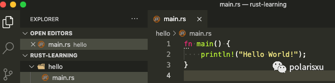 启动 VSCode,在 Welcome 页面选择打开文件夹:~/rust-learning,在 hello 目录下创建 main.rs 文件,输入如下代码: