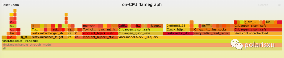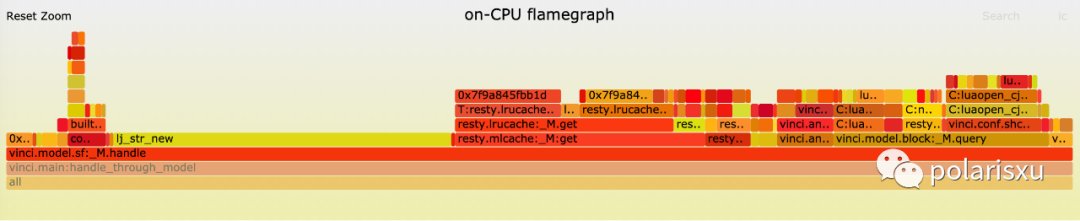 毫无疑问,从 perf top 结果来看,lj_str_new 已经成为了性能最大的短板。不过我们还是要搞一个 lua 语言级别的火焰图看着才靠谱,于是有了下图: