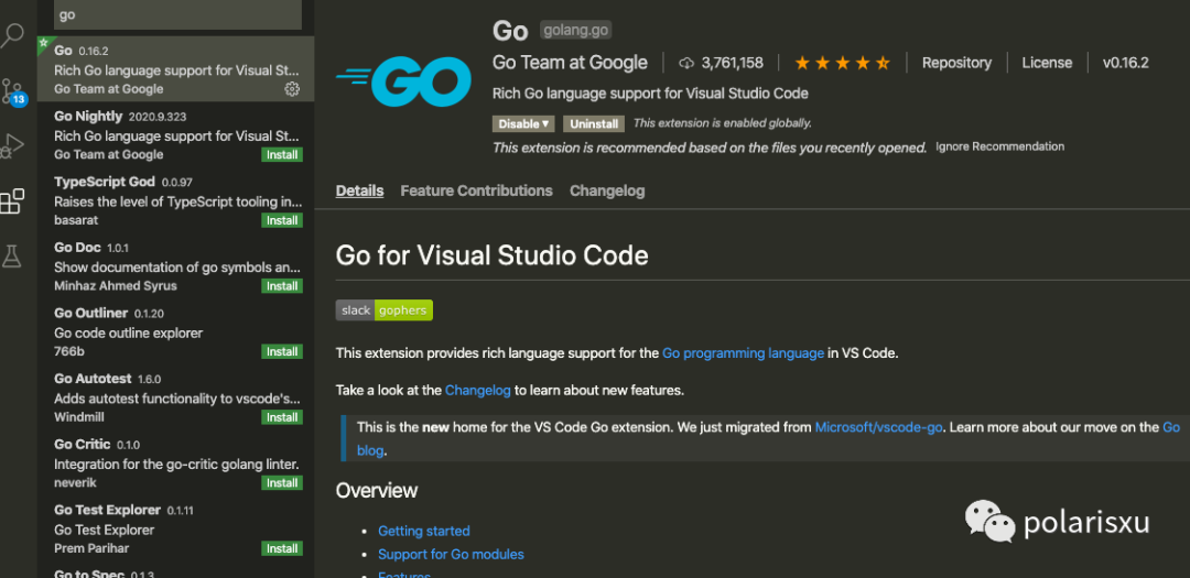 之所以叫 vscode-go,是因为在 GitHub 的项目名是这个,而在 VSCode 中,插件的名称是 Go。该插件最初是微软维护的,目前已经交给 Go Team 维护。
