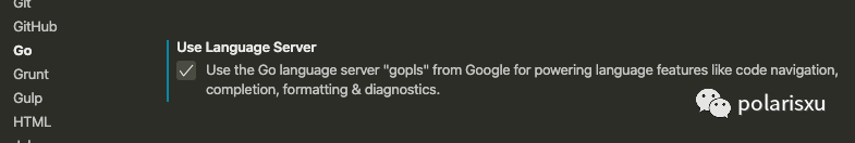 打开 VSCode 配置界面,定位到 Extensions -> Go 中,找到 Use Language Server