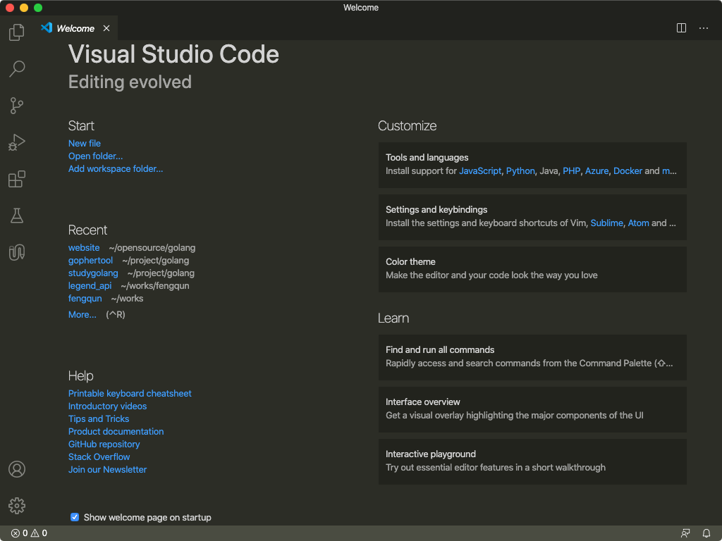 启动 VSCode 后,默认会显示欢迎界面。