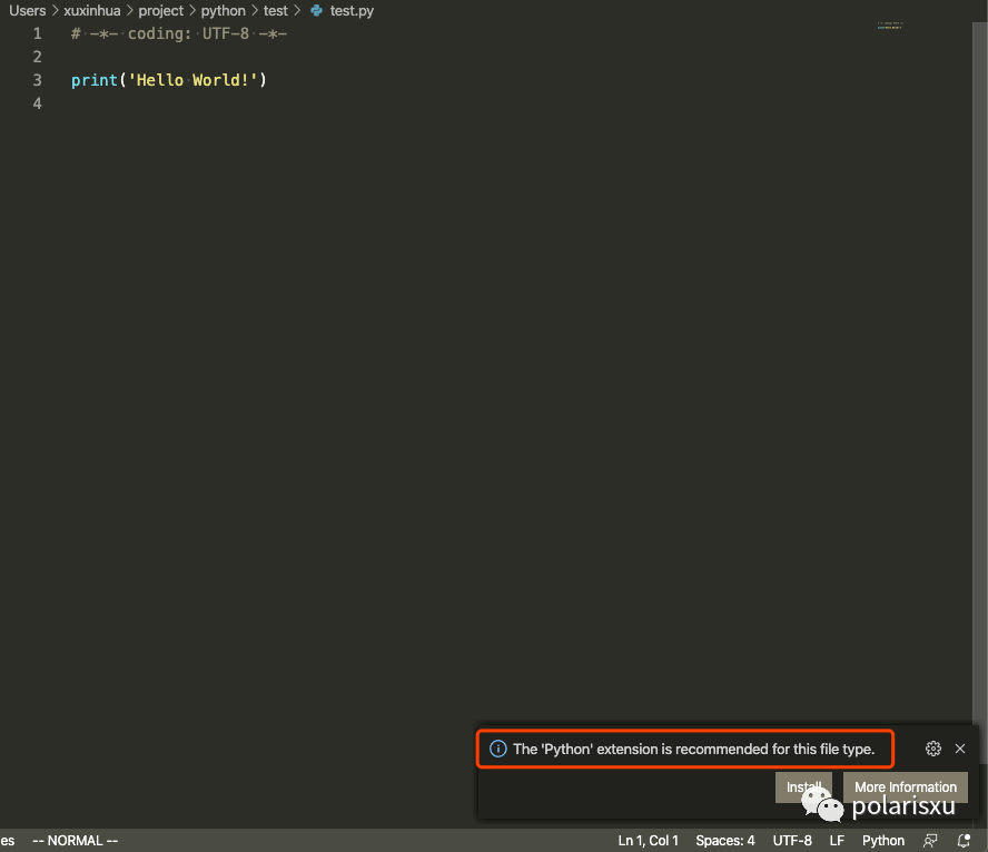 因为插件众多,怎么选择适合自己的插件?VSCode 很友好,在你打开某个类型的文件时,会自动为你推荐合适的插件。比如当你打开一个 Python 源文件时,会出现如下提示(如果未安装):