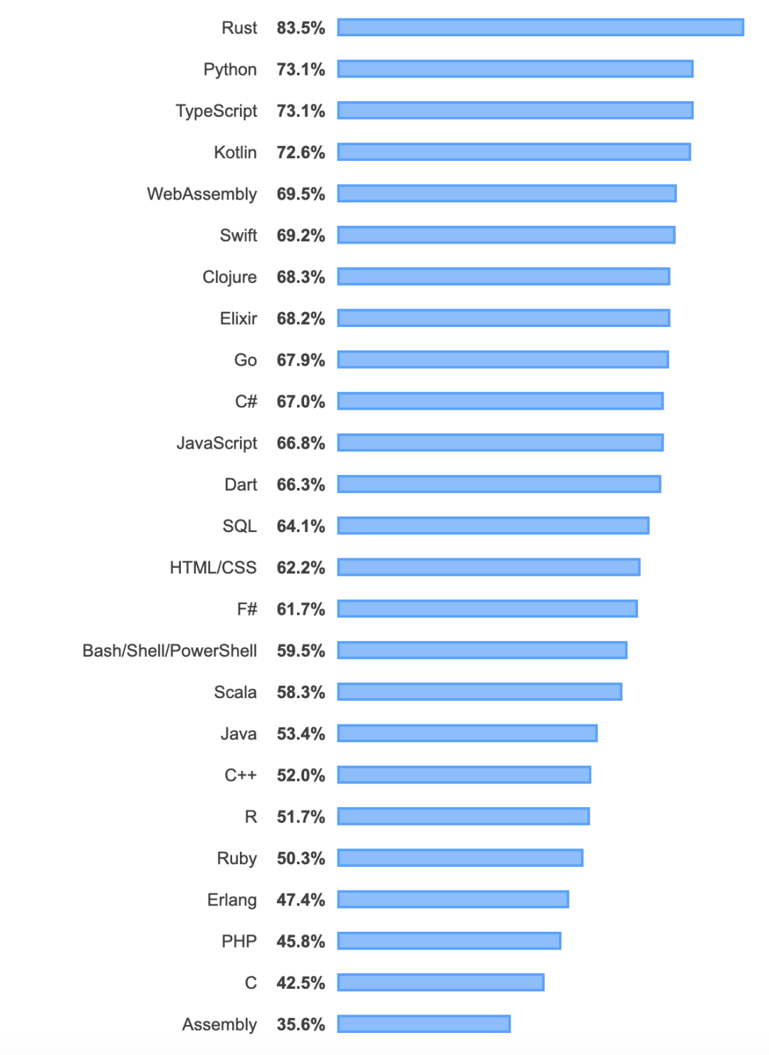 另一个民意调查显示,Rust 的增长速度更快,这一假设得到了更多的佐证—最受喜爱的语言调查:https://insights.stackoverflow.com/survey/2019#technology-_-most-loved-dreaded-and-wanted-languages