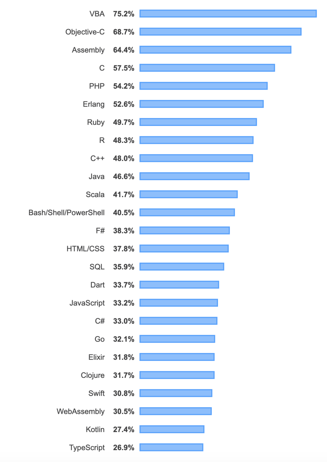 从图表看,Go 实际上是最令人害怕的语言之一,也就是接近底部。我怀疑有此感觉的是 Java 开发人员,他们被迫转移到 Go,也就意味着放弃了他们宝贵的对象和泛型。