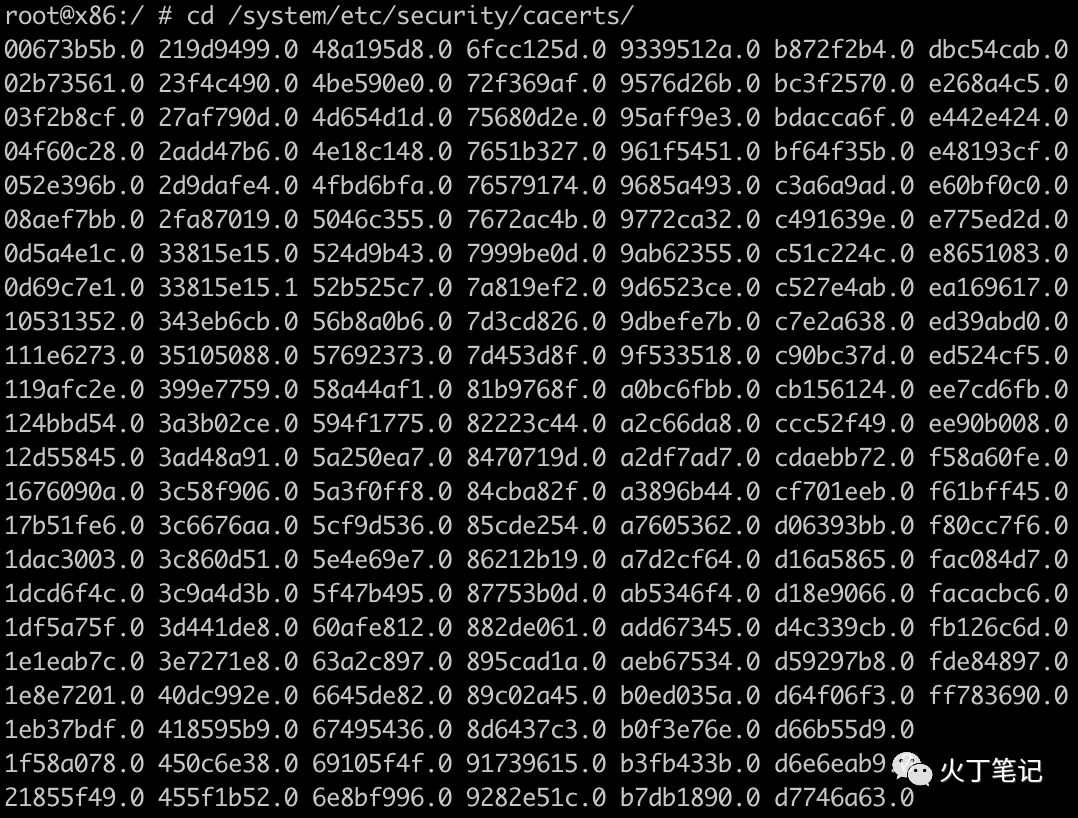 安装好工具之后,别忘了启动网易 MuMu,然后通过 android-platform-tools 中的 adb 命令来连接它,只需要简单执行「adb shell」即可,如果遇到连不上的情况,可以参考文档。连接成功后,你可以在「/system/etc/security/cacerts/」目录看到现有的系统级证书: