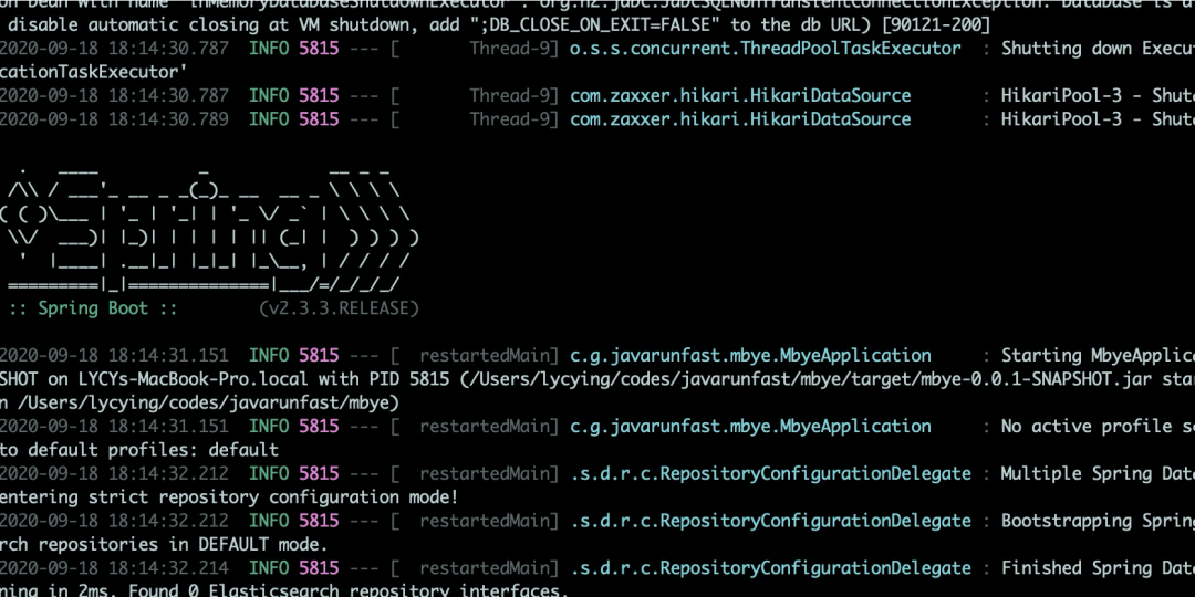 2020-09-18 21:33:59.495 INFO 4635 --- [ restartedMain] c.g.javarunfast.mbye.MbyeApplication : Starting MbyeApplication on LYCYs-MacBook-Pro.local with PID 4635 (/target/classes started by xjjdog in Users/xjjdog/codes/javarunfast/mbye)