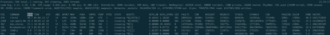 root 981 7.3 0.0 4724748 2764 ?? S 五02下午 73:31.27 hexo