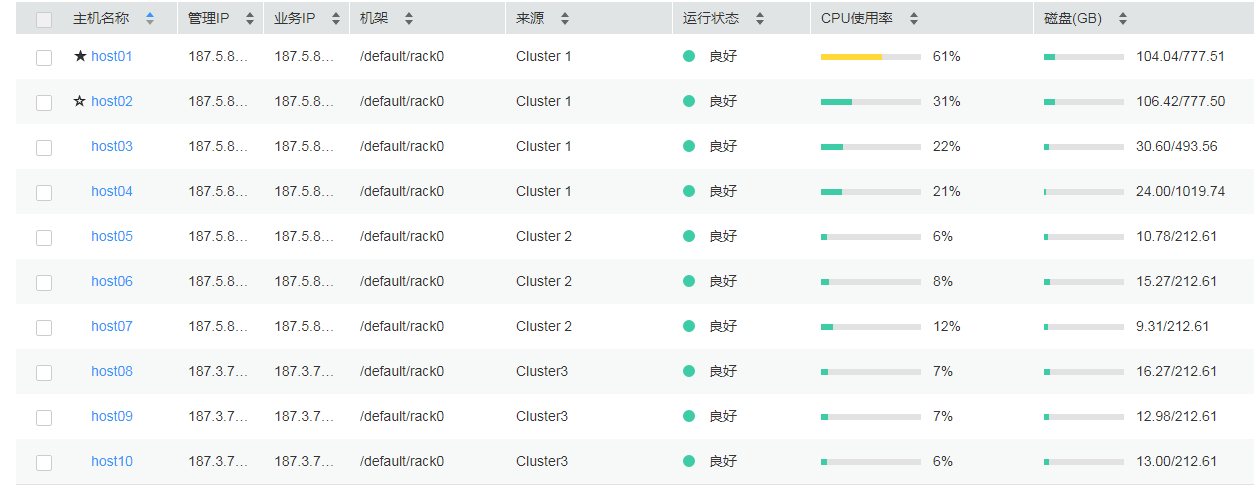 - 管理节点安装了agent进程时,单击“主机”页面跳转到主机列表中查看新添加的主机是否运行状态为“良好”,CPU使用率、内存和磁盘监控信息是否正确。图1 主机监控信息