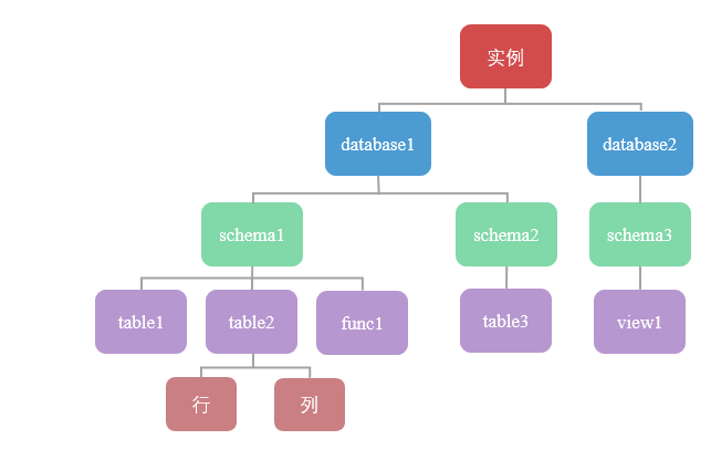在openGauss数据库系统的对象布局逻辑结构中,每个实例下允许创建多个数据库(database),每个数据库下允许创建多个模式(schema),每个模式下允许创建多个对象,比如表、函数、视图、索引等,每个表又可以依据行和列两个维度进行衡量,从而形成如下的逻辑层级: