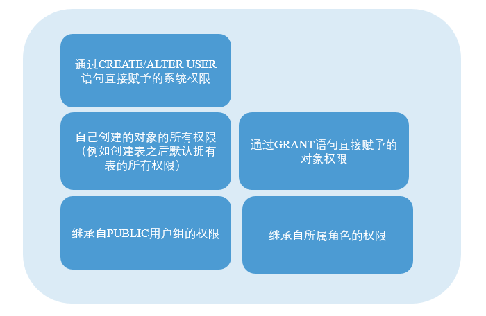 依据openGauss数据库的权限管理机制,一个用户真正拥有的权限是以下几类权限的并集: