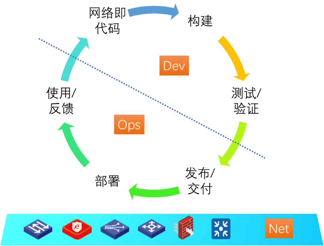 目前网络自动化通常由网络运维团队将需求提交给开发团队实现。从需求提出、代码开发、测试一直到正式投产中间存在巨大的沟通成本和反复的功能测试、代码修改。NetDevOps可显著降低运维和开发之前的沟通成本,加快代码更新迭代频率,缩短新功能上线时间。根据团队自身的水平和经验,可综合使用厂商成熟的商用软件、开源工具或者自研工具实现NetDevOps。