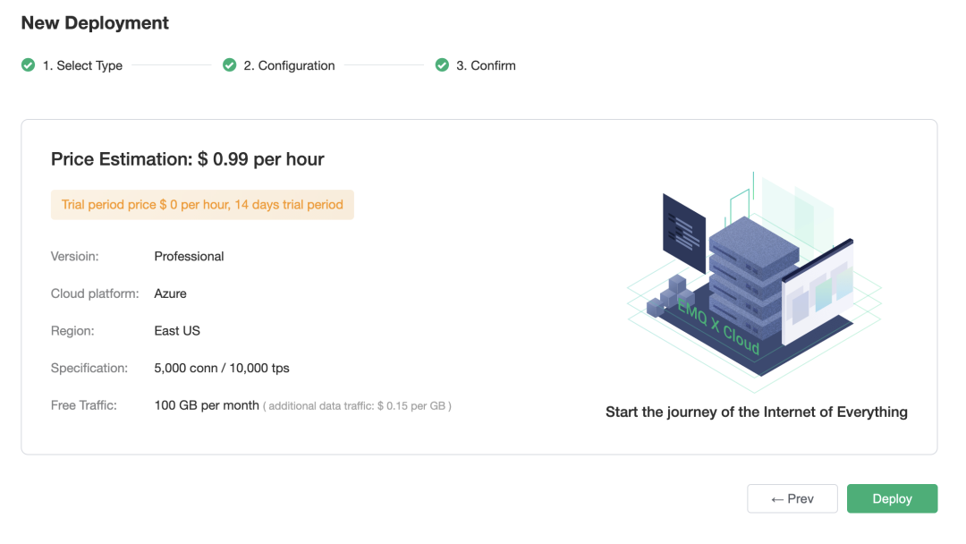 在官网完成注册后,简单操作即可在 Azure 一键部署全托管 MQTT 5.0 服务。