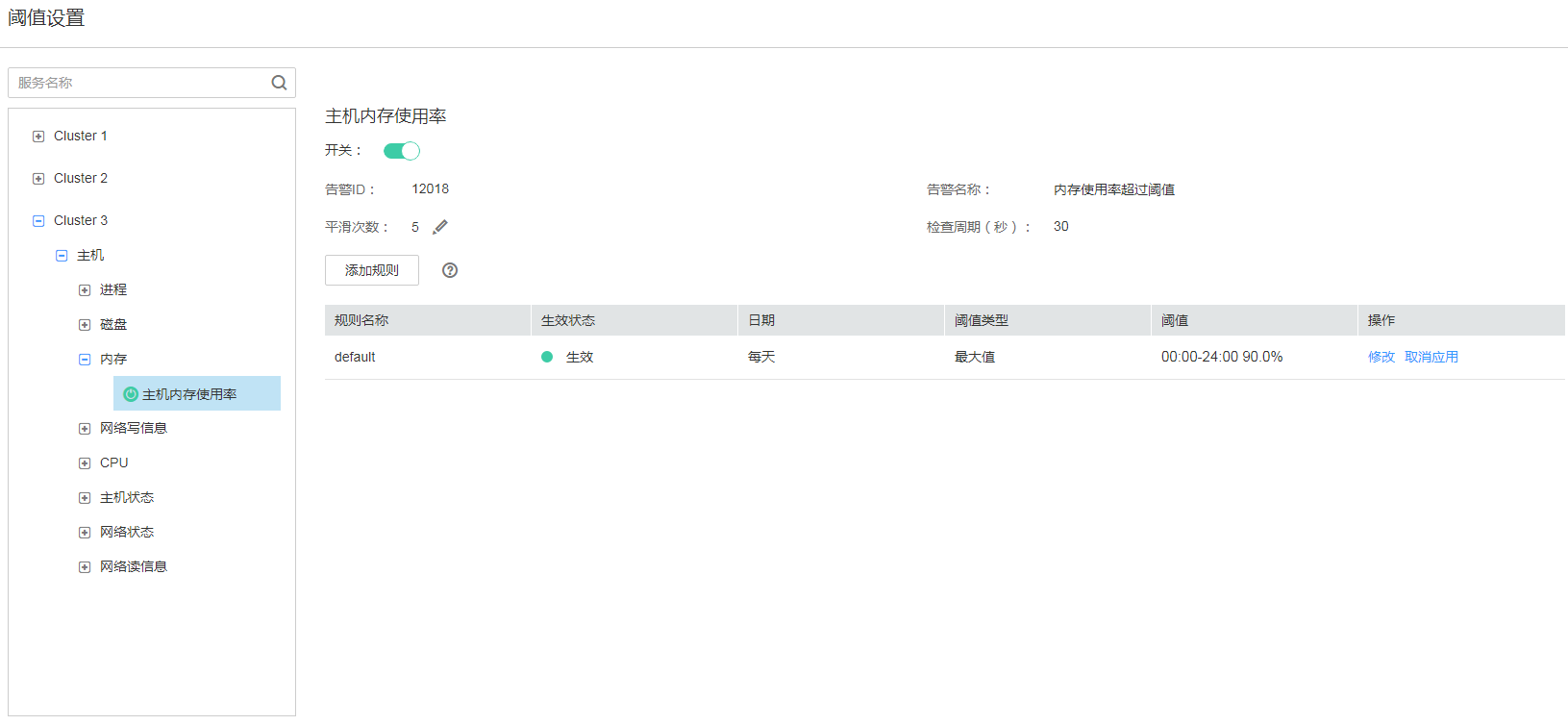 例如“主机内存使用率”,界面显示此阈值的信息:- 发送告警开关指示为