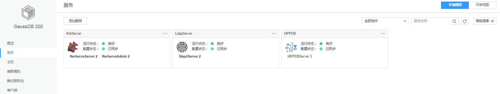 - 检查服务的状态。选择“集群 > 待操作的集群名称 > 服务”,各服务的“运行状态”为“良好”。如图1所示。图1 服务状态