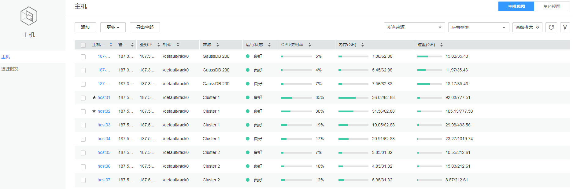 - 检查节点状态。在FusionInsight Manager页面单击“主机”,各节点的“运行状态”为“良好”。如图2所示。