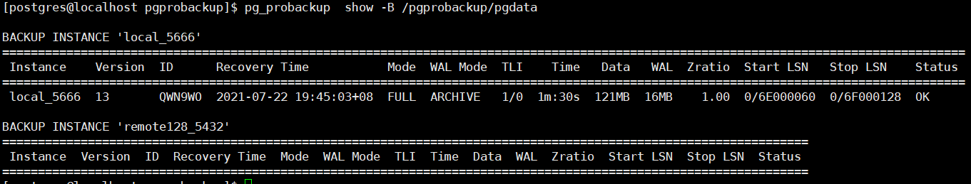 [postgres@localhost pgprobackup]$ /usr/local/pgsql/bin/pg_probackup show -B /pgprobackup/pgdata