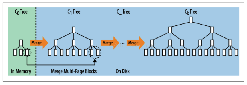 首先内存中存在的树叫C0 tree,写入都从C0 tree开始。具体呈现形式可以是任意方便健值查找的数据结构,比如红黑树、Map、跳表等等。而C1 tree、C2 tree一直到Ck tree都存储在硬盘上。