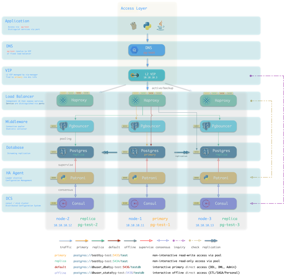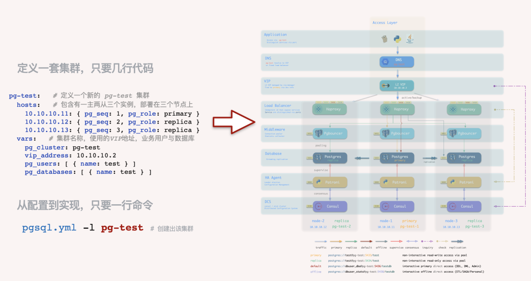 Pigsty的高可用架构久经生产环境考验,以极小的复杂度实现了完整的高可用方案,让传统主从架构的数据库用出分布式数据库的感觉。