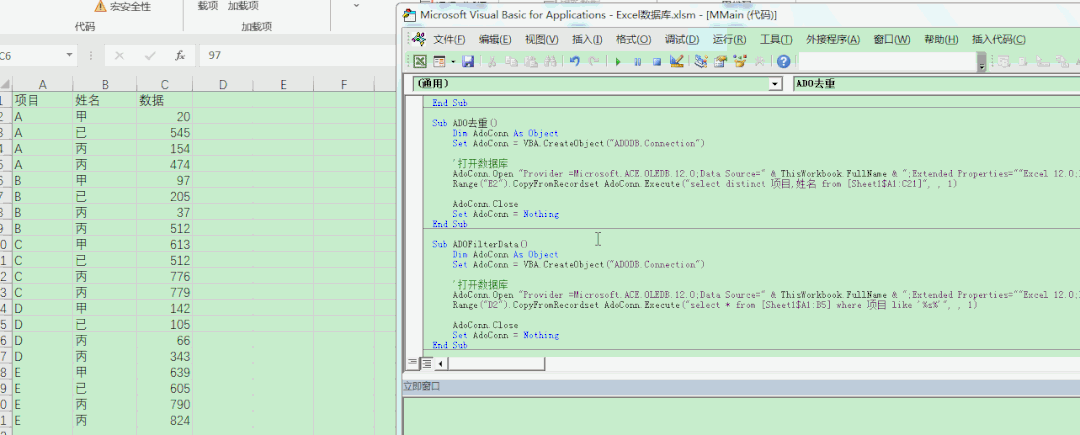 Sub ADO去重()Dim AdoConn As ObjectSet AdoConn = VBA.CreateObject("ADODB.Connection")'打开数据库AdoConn.Open "Provider =Microsoft.ACE.OLEDB.12.0;Data Source=" & ThisWorkbook.FullName & ";Extended Properties=""Excel 12.0;HDR=YES"";"Range("E2").CopyFromRecordset AdoConn.Execute("select distinct 项目,姓名 from [Sheet1$A1:C21]", , 1)AdoConn.CloseSet AdoConn = NothingEnd Sub