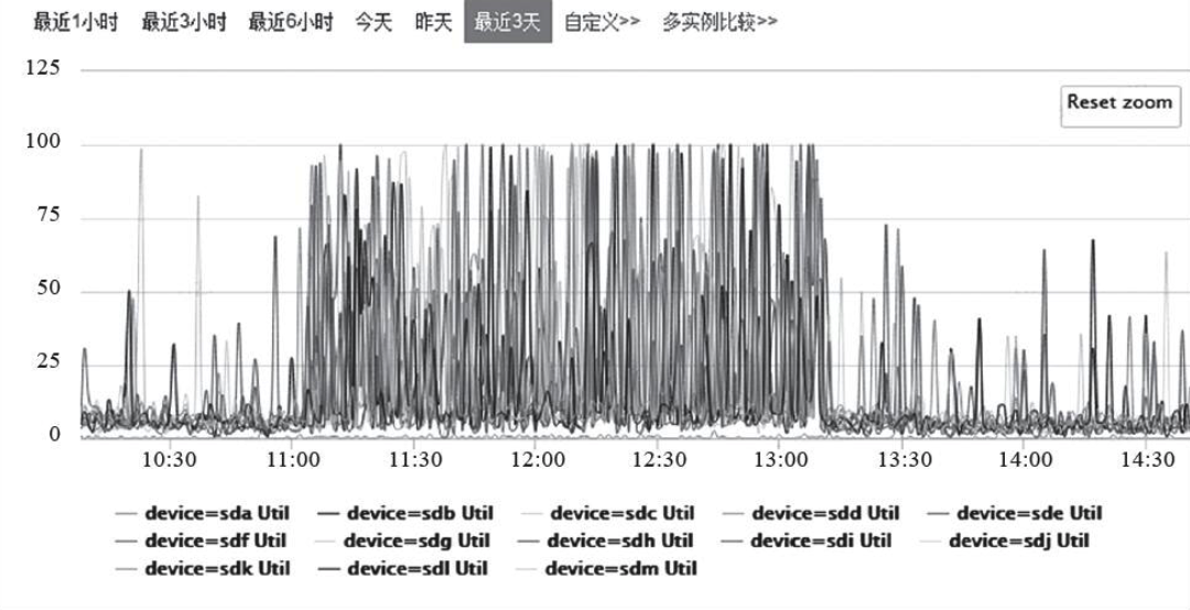 指标监控分析。很多问题都可以直接在监控界面上直观地找到答案。比如业务反馈在某一时刻后读延迟变得非常高。第一反应是去查看系统IO、CPU或者带宽是不是有任何异常,如果看到IO利用率在对应时间点变得异常高,就基本可以确认读性能下降就是由此导致。虽说IO利用率不是本质原因,但这是问题链上的 重要一环,接下来探究为什么IO利用率在对应时间点异常。