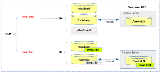 Linux中存在两种形式的swap分区:swap disk和swap file。前者是一个专用于做swap的块设备,作为裸设备提供给swap机制操作;后者则是存放在文件系统上的一个特定文件,其实现依赖于不同的文件系统,会有所区别。