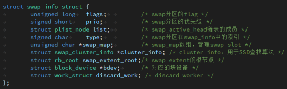swap_info_struct结构体来管理swap分区,其关键成员如下: