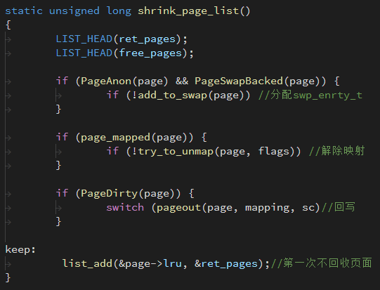内核中的内存回收流程,最终都会走到shrink_page_list中,该函数对page_list