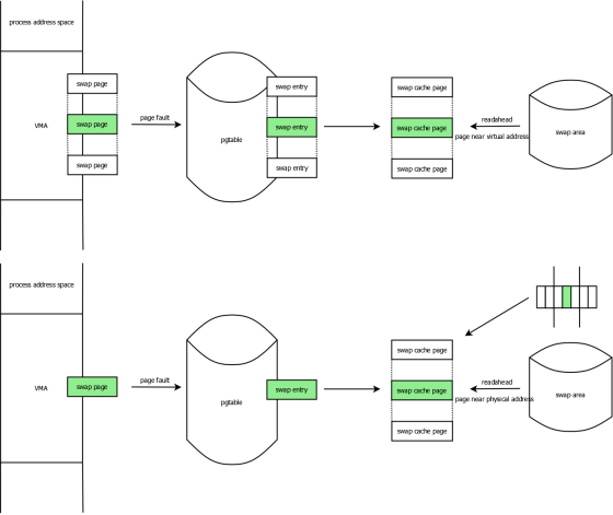 IO预读机制,swap in的流程中也实现了预读。由于SSD的随机读写能力要强于HDD,在基于物理地址的预读机制之外,内核还引入了基于VMA的预读。两种预读方式可以通过/sys/kernel/mm/swap/vma_ra_enabled节点进行选择。