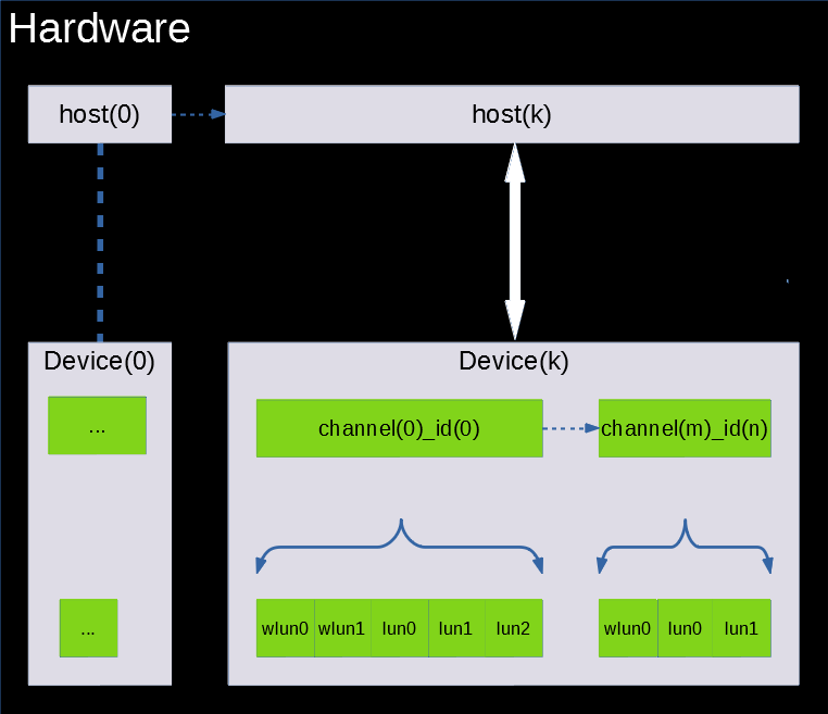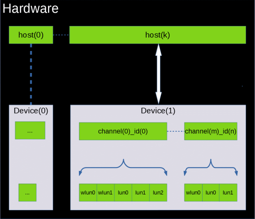 每个device内部有若干个channel,每个channel下面有若干个id,每个id下面有若干个lun。