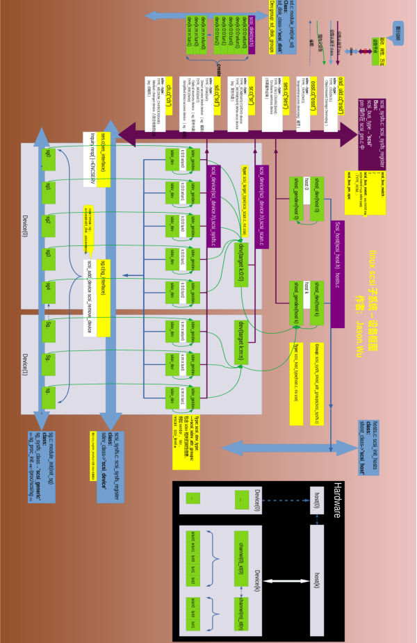 由于linux scsi子系统代码庞大,直接说代码,会把人绕进去,这里会通过linux设备驱动模型中的bus,class,device框图来描述linux scsi子系统框架,后面会结合框架,指出子系统中的关键代码和位置。
